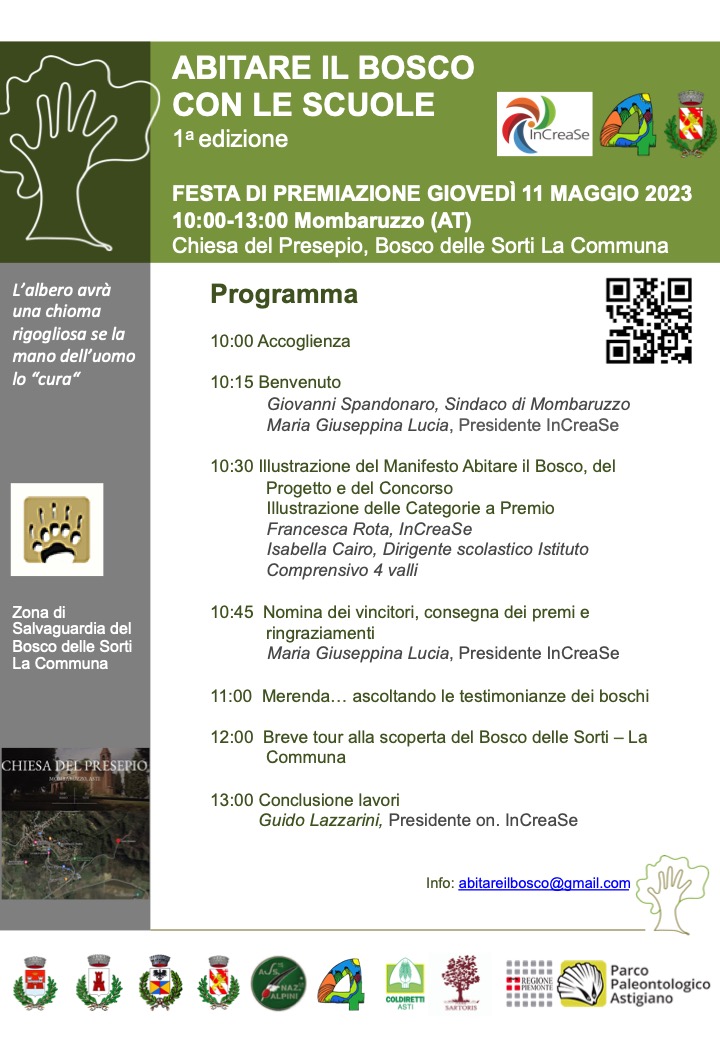 Il Gruppo Abitare il Bosco va verso la conclusione del suo primo anno di attività con le Scuole dei comuni di Mombaruzzo, Calamandrana, Castelnuovo Belbo e Cortiglione. A sigillare questa bella esperienza di didattica e educazione ambientale ispirata alla cura dei boschi, l'11 maggio si terrà la festa di premiazione dei lavori delle classi che hanno aderito al concorso artistico.